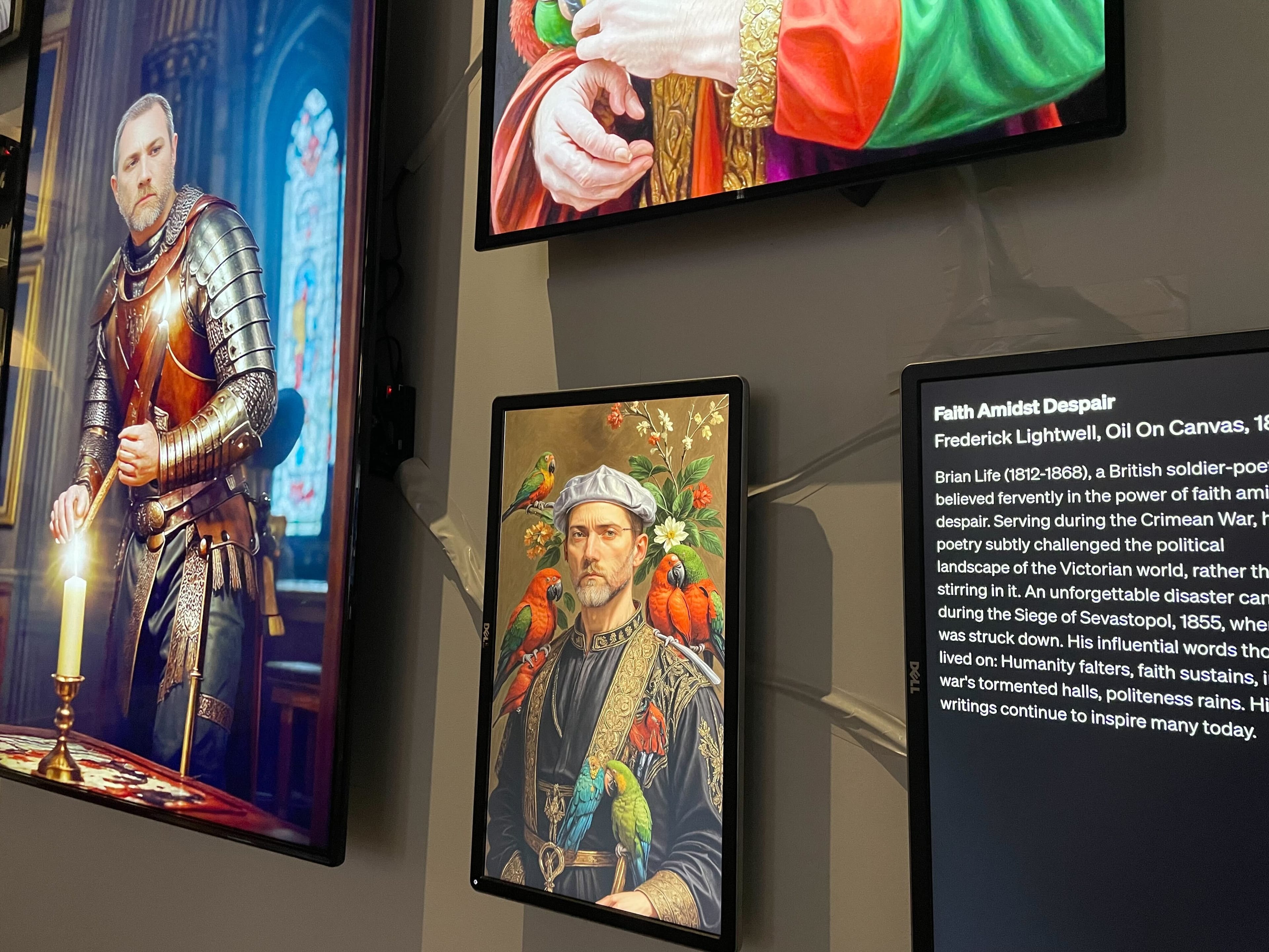 Next came the "Gallery," a hyper-photogenic art space where Heroes explored stunning high-resolution portraits of themselves in legendary moments—trench warfare of WWI, the excitement of a music festival, the rugged Old West, pirate shipwrecks, and gritty boxing rings. The visuals ranged from bold illustrative styles to hauntingly lifelike photography. Beside each masterpiece, digital wall labels offered intriguing and offbeat narratives about these imagined lives.